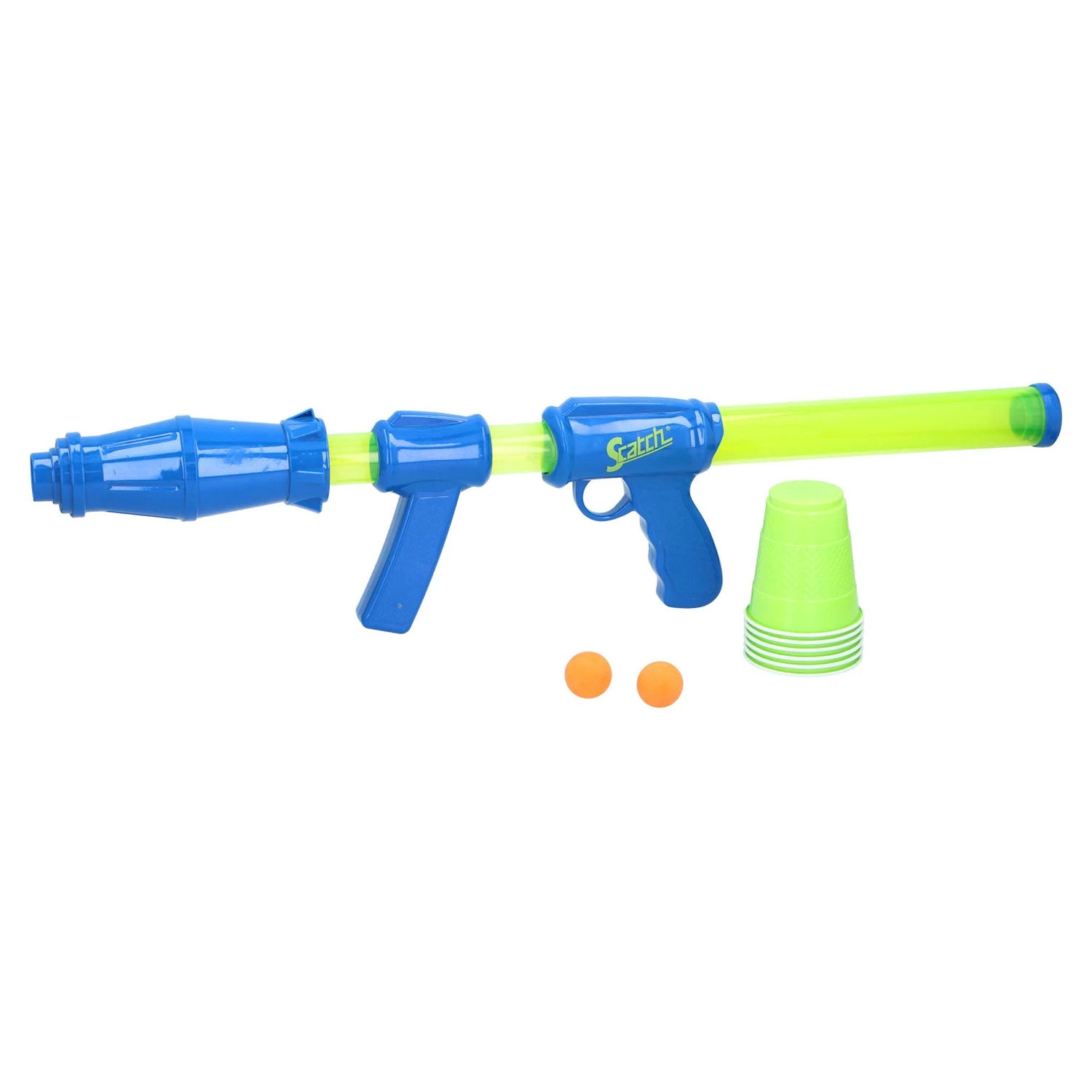 Dit groen/blauwe luchtpistool knalt de oranje ballen tot wel 8 meter ver. Er kunnen meerdere ballen achter elkaar geschoten worden. De loop van het luchtpistool is 360° draaibaar. In de set zitten 15 oranje softballen, 6 bekers en 6 stickers. Het luchtpistool is 67,5 centimeter lang.