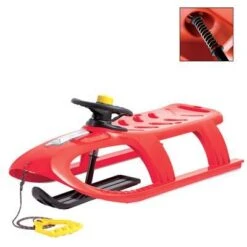 Kunststof slee in rode kleurstelling, met metalen geleiders. Voorzien van een touw met handvat. Afmetingen: 102,5 x 40 x 23 cm. Geschikt voor kinderen vanaf 3 jaar.