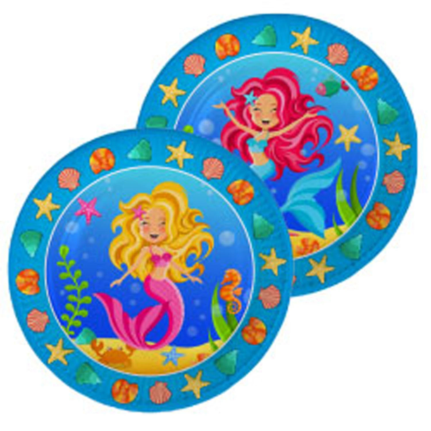 Bij een zeemeermin feestje horen natuurlijk ook zeemeermin bordjes. De bordjes hebben een diameter van 23 cm en zijn voorzien van een leuke afbeelding van een zeemeermin die onder water is omgeven door een rand van schelpen. Verpakt per 8 stuks, 4 bordjes met een blauwe zeemeermin en 4 bordjes met een roze zeemeermin.