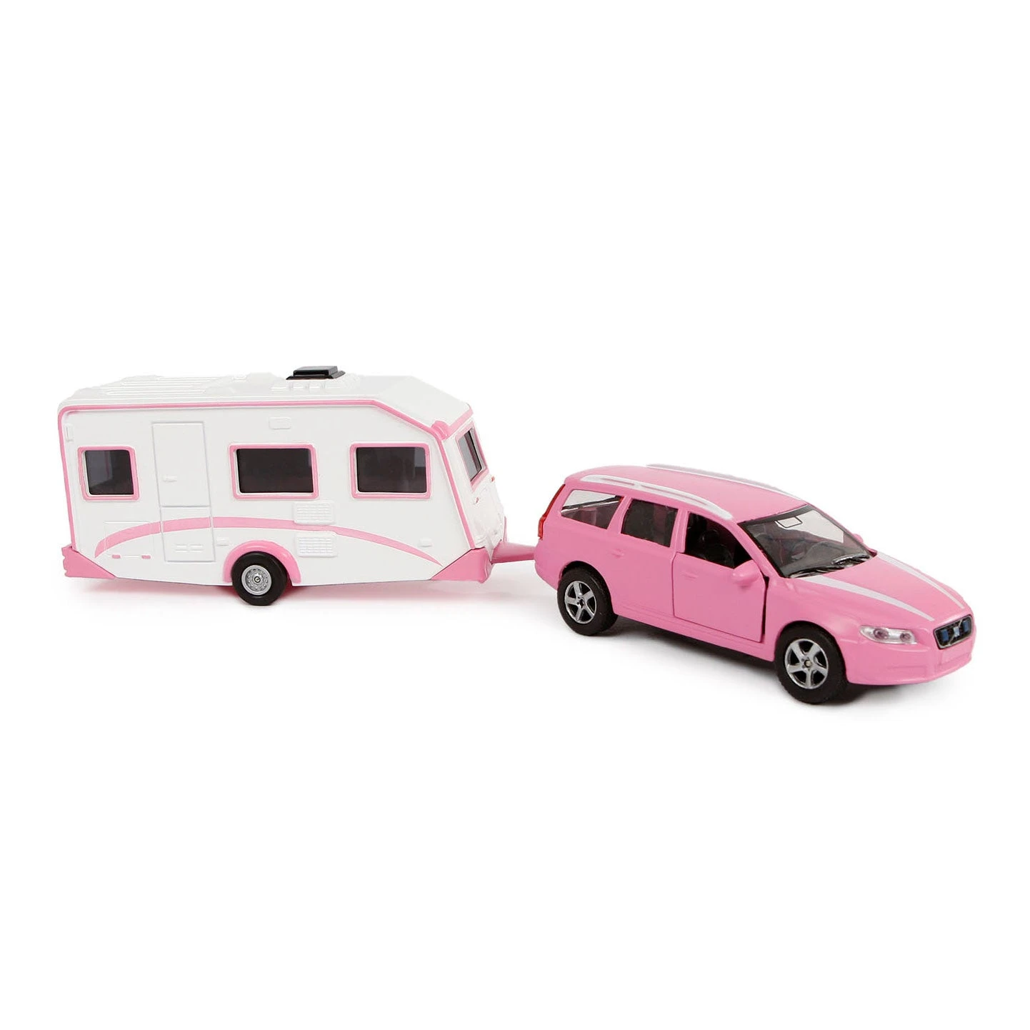 Deze roze Volvo trekt de roze met witte caravan zonder problemen! Ga op vakantie met deze roze auto! De deuren van de wagen kunnen open en dicht. Door het pull back mechanisme kan de auto zelf rijden wanneer je deze achteruit trekt over de grond en dan loslaat. De auto inclusief aanhanger is 30 centimeter lang. Gemaakt van kunststof en metaal.