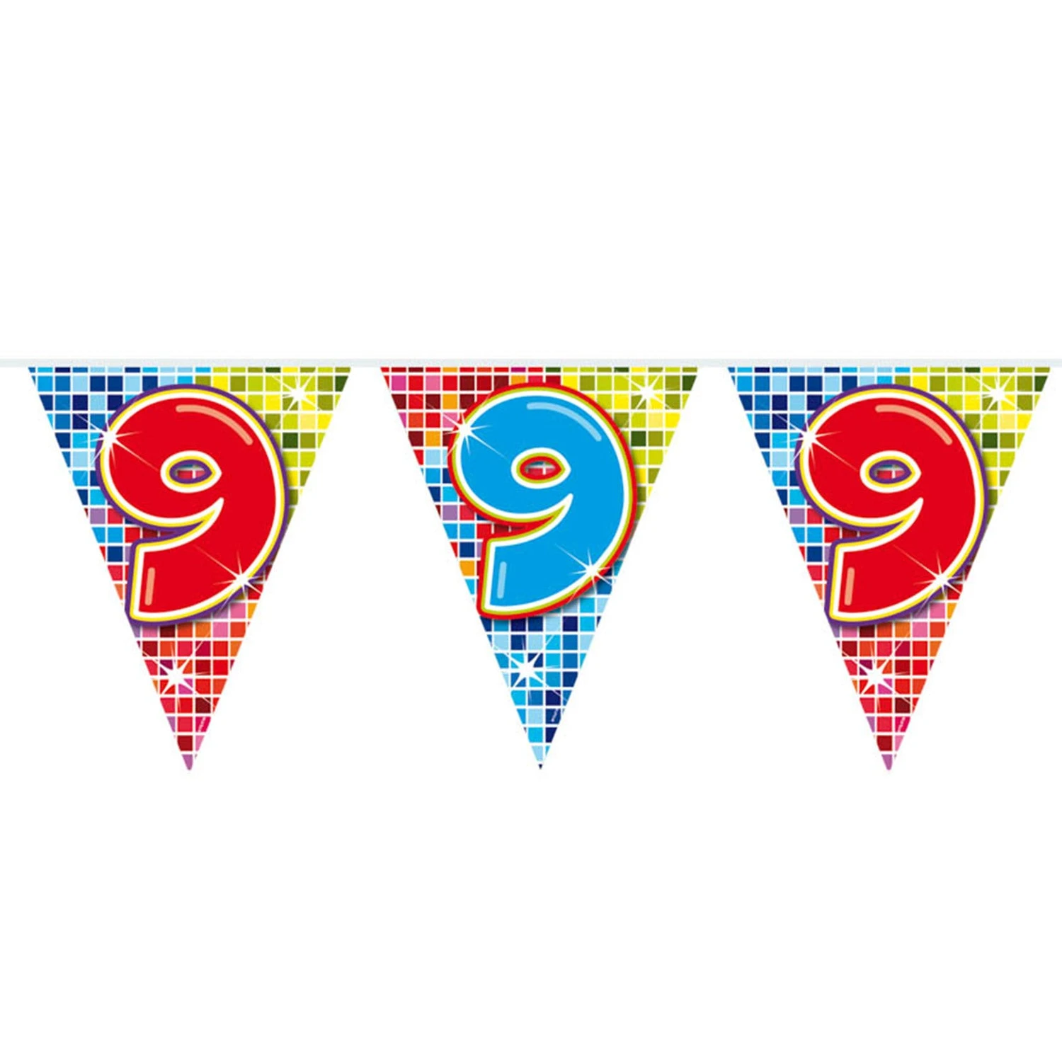 Wordt er iemand 9 jaar? Of vieren jullie een 9-jarig jubileum? Deze kleurrijke slinger staat perfect op ieder soort feestje! De slinger is enkelzijdig bedrukt, heeft 12 vlaggetjes en is 3 meter lang.