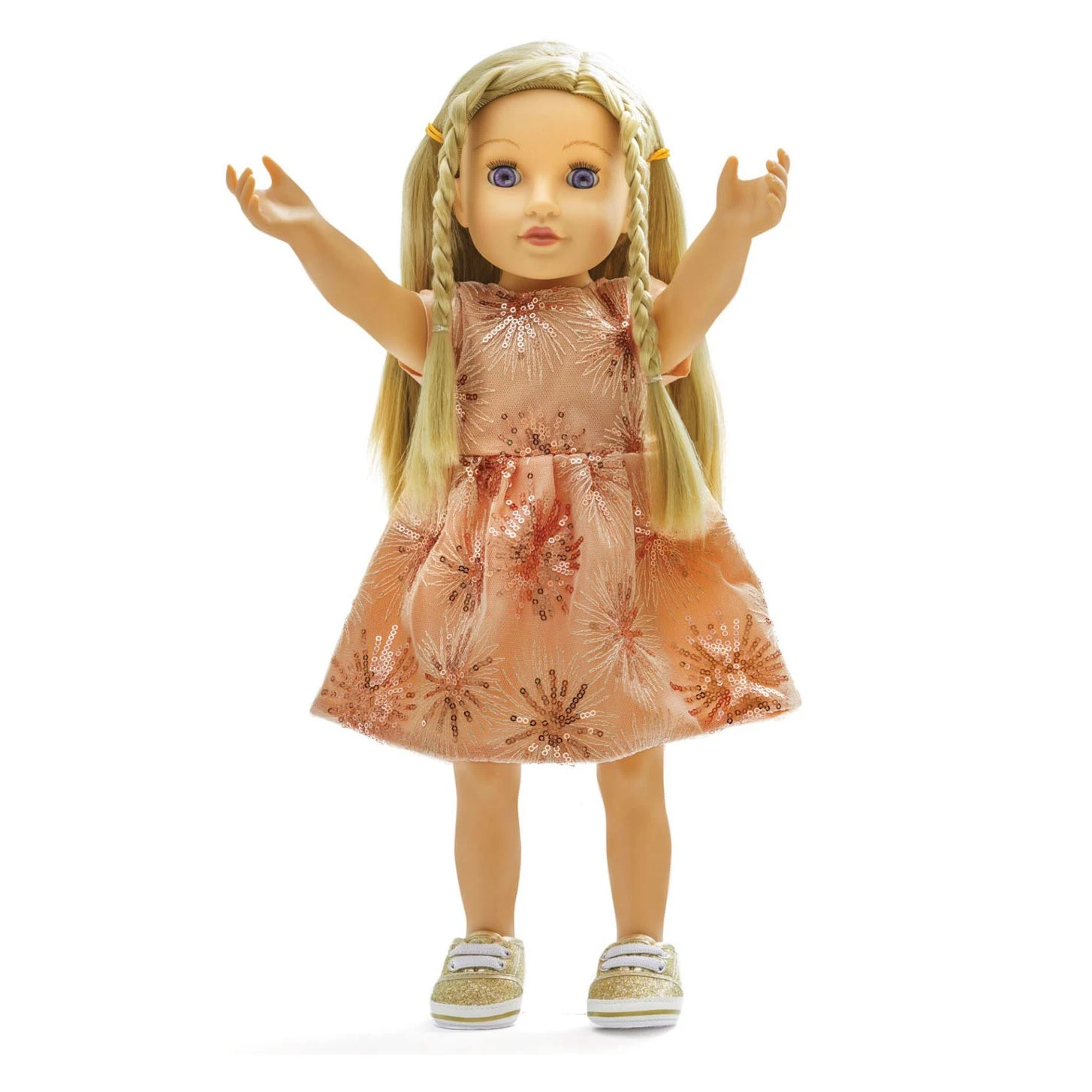 Schitterende rosegouden poppenjurk met pailletten. Met klittenbandsluiting. Geschikt voor poppen in maat 28-35 cm en kinderen vanaf 3 jaar.