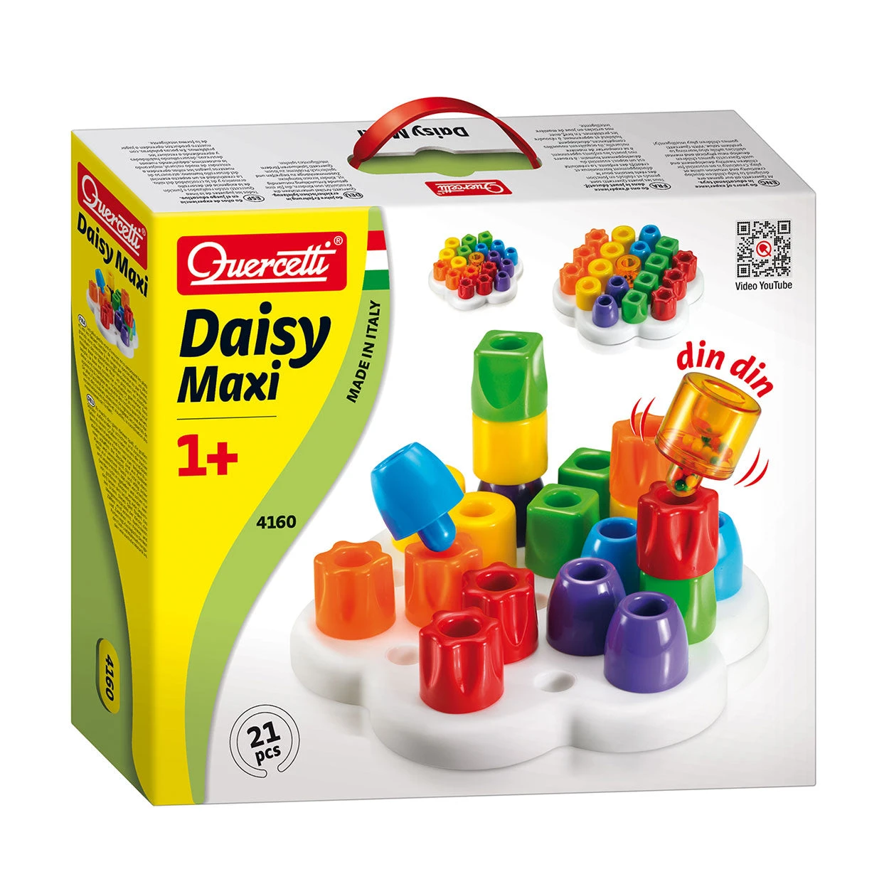 Deze Quercetti Daisy Maxi set is ideaal voor jonge kinderen. Kinderen stapelen met plezier deze 20 grote pinnen op elkaar. En laten ze weer omvallen… Oudere kinderen kunnen de pinnen sorteren per kleur of vorm, ze vastknopen, tellen, patronen mee maken en 3D structuren mee bouwen. De pinnen zijn gemaakt van kunststof en het bord is gemaakt van flexibele rubberplastic. Onbreekbaar, wasbaar en plezierig om vast te pakken. Compatibel met 4150 Geokid Tris. Geschikt voor kinderen vanaf 1 jaar.