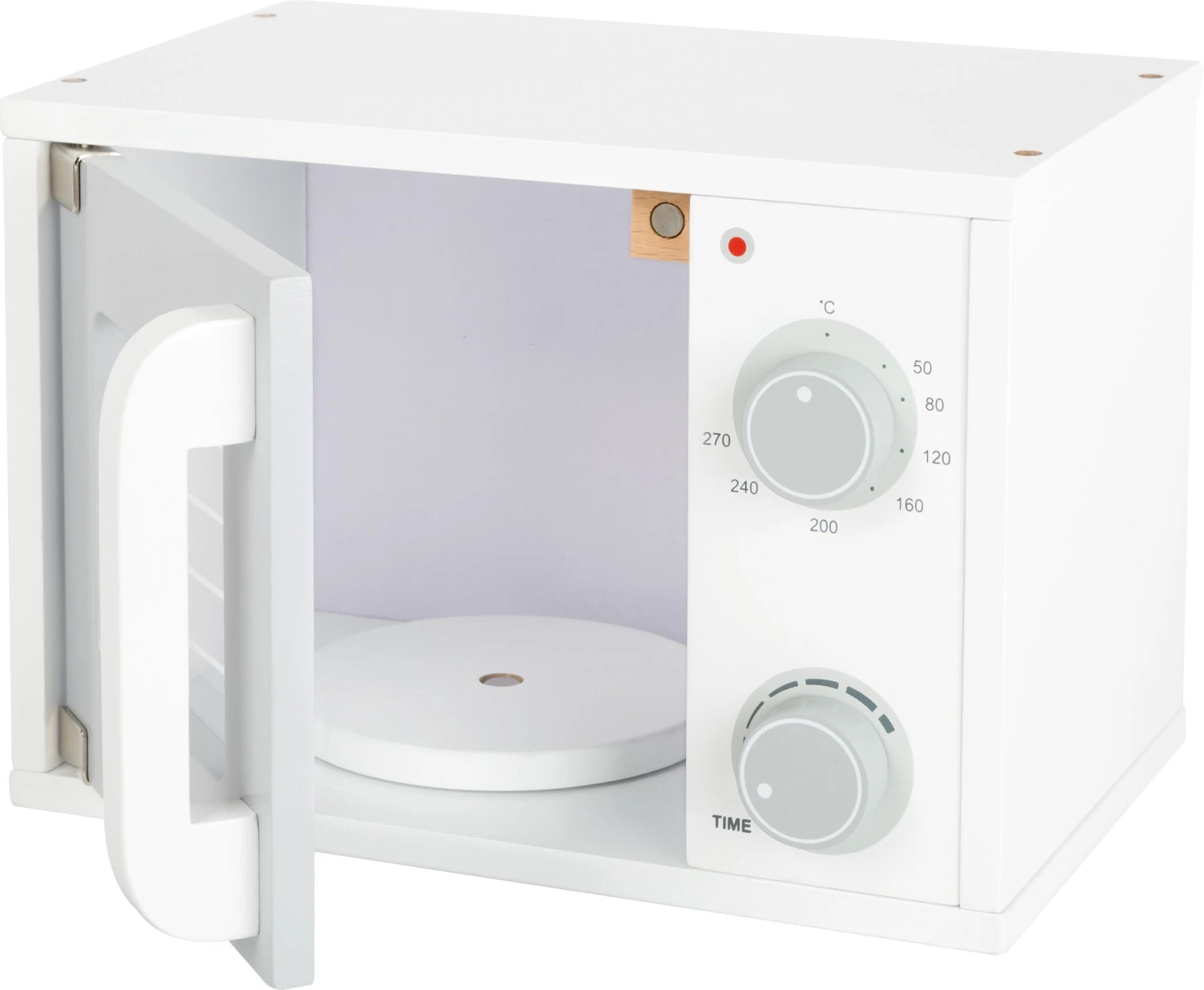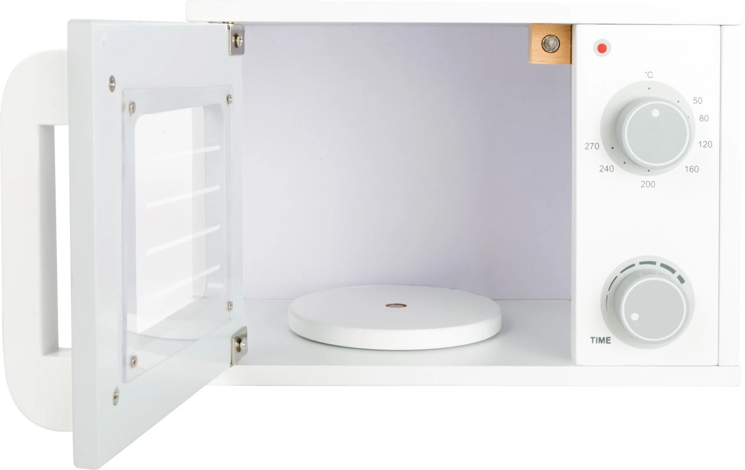 Ding…het eten is klaar! Kinderen kunnen in een handomdraai doen alsof ze eten opwarmen en bereiden met deze houten speelmagnetron. Deze realistische speelmogelijkheid heeft een draaibare plaat en een deur die gesloten wordt door een magneet. De temperatuur en tijdfuncties kunnen eenvoudig worden ingesteld met de draaibare knoppen met een klikkend geluid. Een praktisch huishoudtoestel dat in elke moderne kinderkeuken thuishoort. Een praktisch huishoudtoestel dat in geen enkele moderne kinderkeuken mag ontbreken en een ideale aanvulling in elke kinderkeuken die geen magnetron heeft.