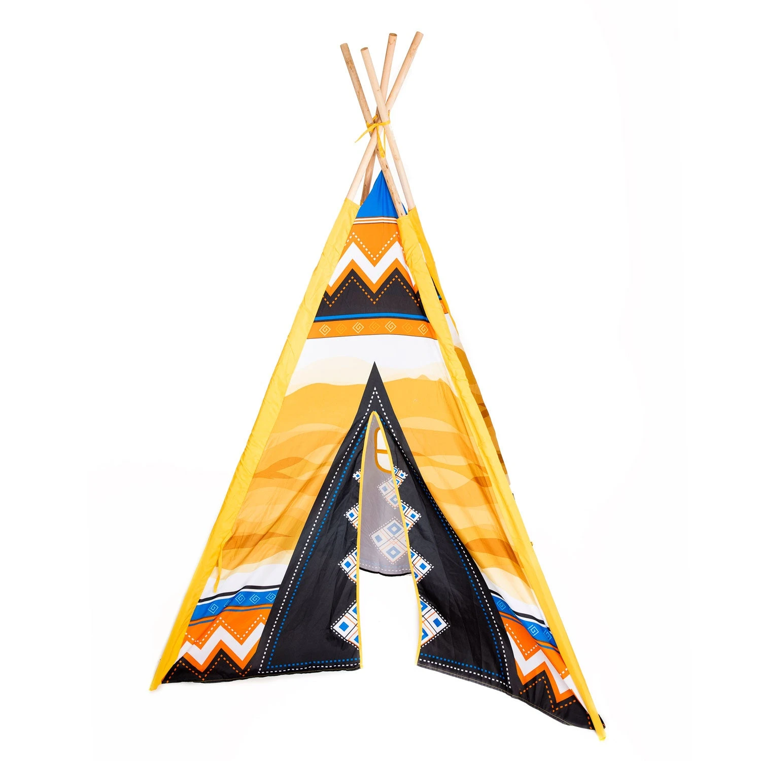Whoewhoewhoewhoe! Lekker indiaantje spelen in de Speeltent Tipi Indiaan. Wat lijkt hij veel op een echte indianentent! De tipitent staat overeind door 4 houten stokken die in een punt zijn geknoopt. De tent is gemaakt van nylon en heeft een coole indianenprint: met kleurrijke patronen en een indianentooi. De Speeltent Tipi Indiaan heeft een grondoppervlak van 120 bij 120 centimeter en een hoogte van 150 centimeter.