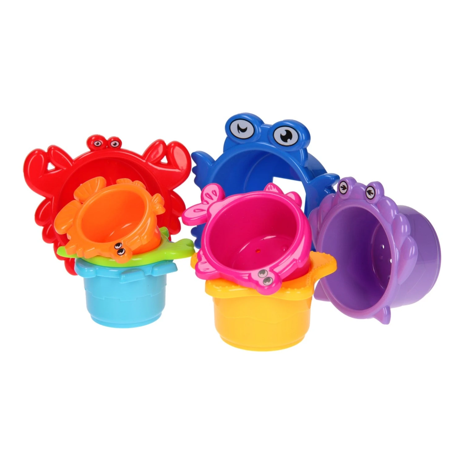 Stapel de vrolijk gekleurde stapelbekers in de juiste volgorde op elkaar en maak een echte toren! Vul het bovenste schaaltje met water en zie hoe het via de verschillende etages naar beneden loopt.