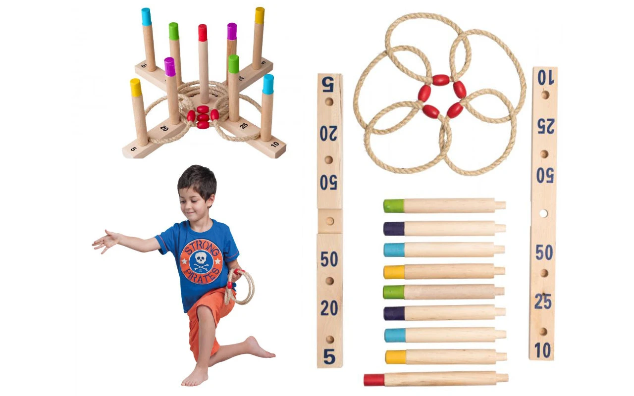 Kinderen zullen fijn kunnen oefenen met dit vrolijke kleuter spel ringengooi spel wat gemaakt is hout en sisaltouw.
